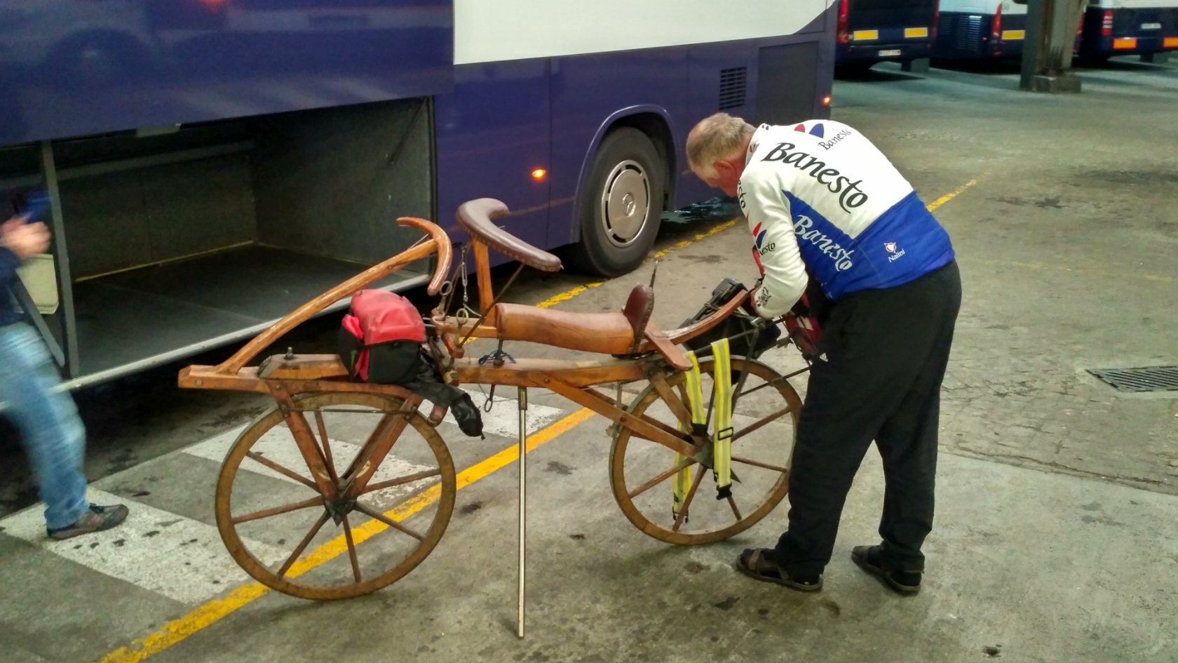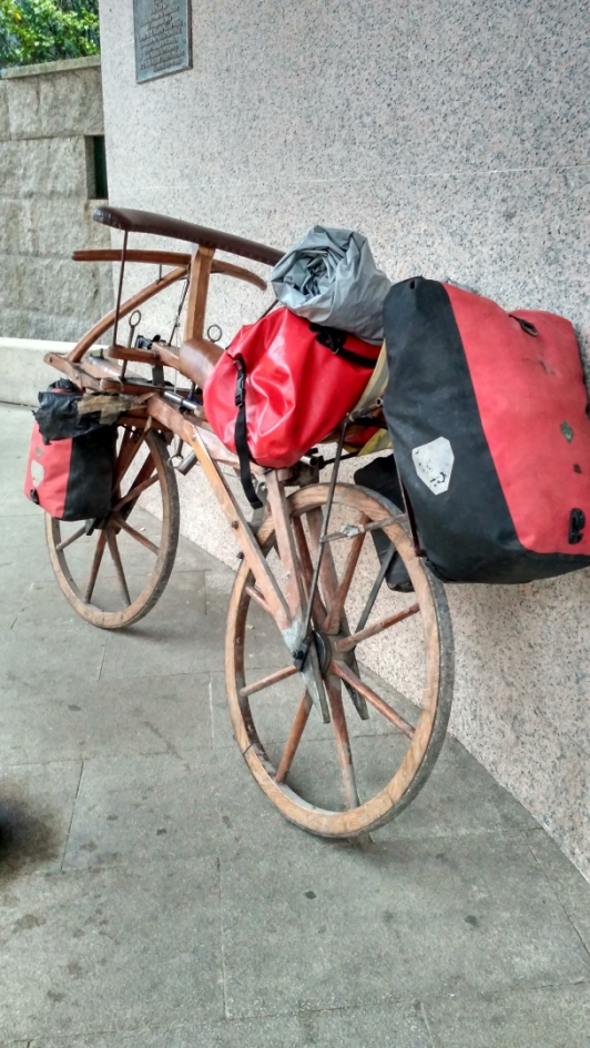 Рано утром я застал офигительный рассвет. А затем первый автобус, в который даже не все пешие странники поместились, не то что я с великом. Пришлось ждать 2 часа до следующего и надеяться, что за это время не наберётся много людей. С великом в автобусе можно, но приоритет отдаётся пешим. На остановке было деревянное нечто, похоже как пол шасси кареты. Я сначала сфоткал, думал мол скульптура. А потом в кафе напротив автобусной остановки познакомился с владельцем. Это был мужичок лет 60, родом из ЮАР и живущий в Австрии. А «карета» это реплика старого бего-велосипеда. Там нет педалей, и нужно сидя бежать. На тот момент, он «проехал» уже 3000 км.